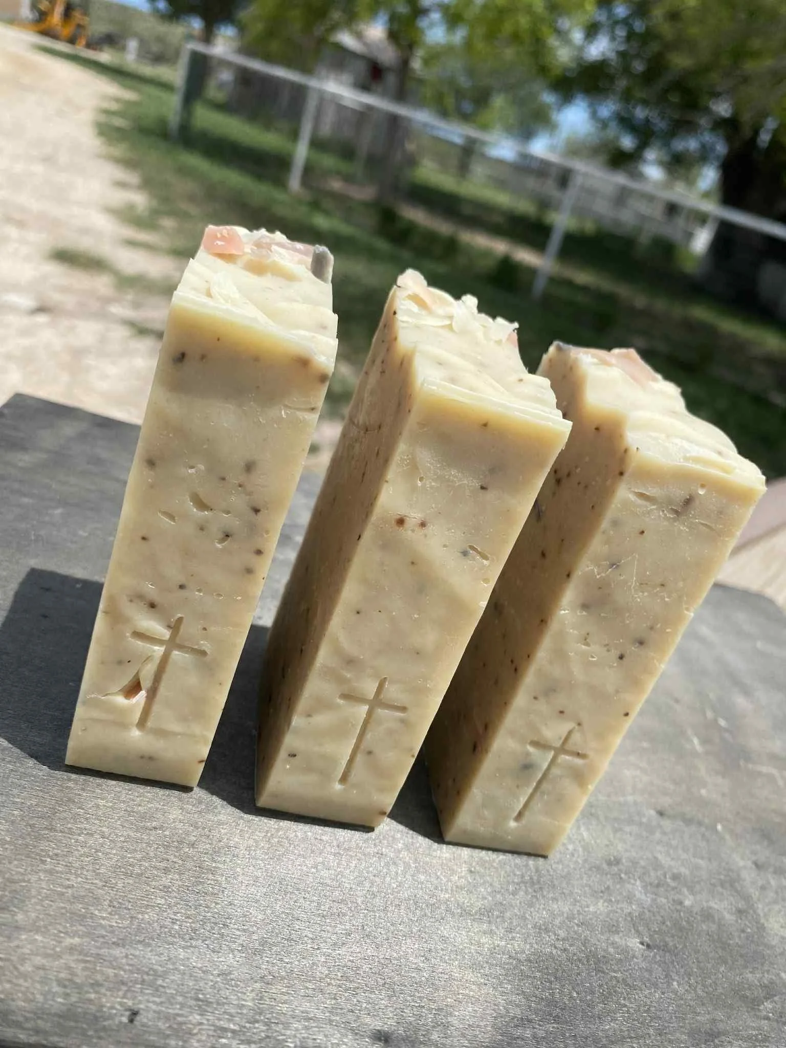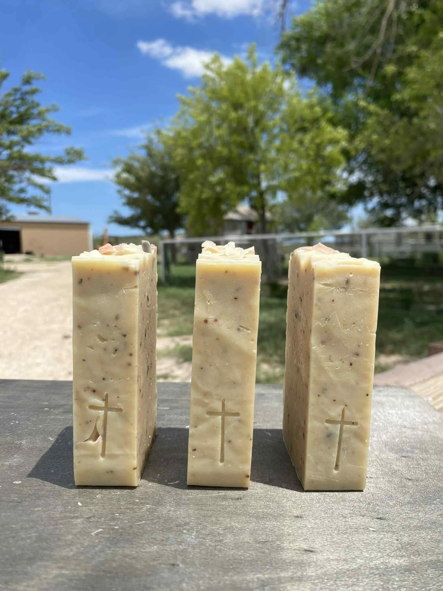 Ingredients: Saponified Lavender & Rosemary infused Olive Oil, Raw Goats Milk, Coconut Oil*, Lard, Raw Unrefined Shea Butter, Hexane Free Castor Oil*, Coconut Milk*, Cane Sugar*, Corn Silk (from home grown corn), Egg (from our free range hens), Bison Fiber, Rose Petals, Lemon Balm*, Madder Root, French Green Clay, Pink Kaolin Clay, Essential Oils of Eucalyptus, Peppermint & Litsea. Topped with wild picked dried Texas Wildflowers.